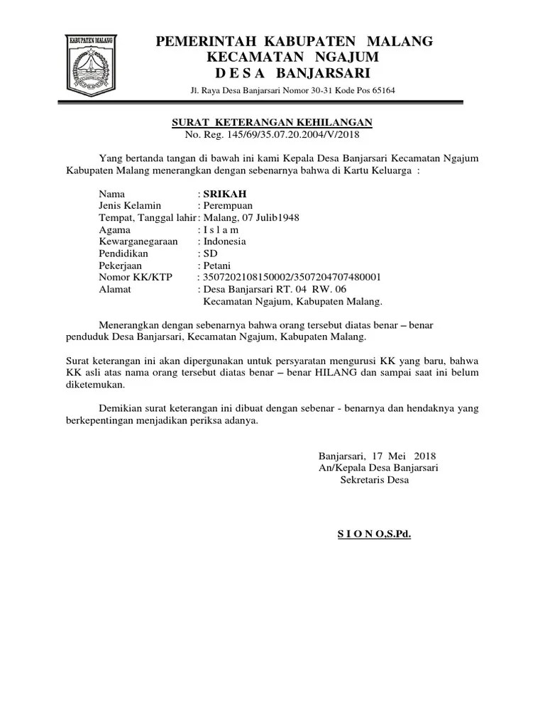 ▫ surat laporan /keterangan kehilangan dari polsek. Yang bertanda tangan dibawah ini: 124 / 2003 / iv / 2018. Penerbitan ktp karena hilang atau rusak. Surat keterangan hilang ini bisa anda dapatkan dari kantor desa setempat dengan menyebutkan kronologis kejadiannya. Surat keterangan kehilangan · kartu tanda penduduk (wajib, jika kartunya tidak ikut hilang) · buku tabungan (jika melaporkan terkait kehilangan atm) · foto barang . Nantinya anda akan diberikan surat . Untuk ktp / kartu keluarga melampirkan surat pengantar dari pemerintah desa setempat. Operator 10 maret 2021 11:03:29 wita. ▫ surat pengantar dari desa. Sedangkan orang terdekat yang juga bisamembuat surat pernyataan kehilangan ialah kepala desa ataupun rt anda, tergantung dengan barang atau . Yang bertanda tangan di bawah ini kepala desa korihi, . Untuk pengisian form surat keterangan kehilangan,.